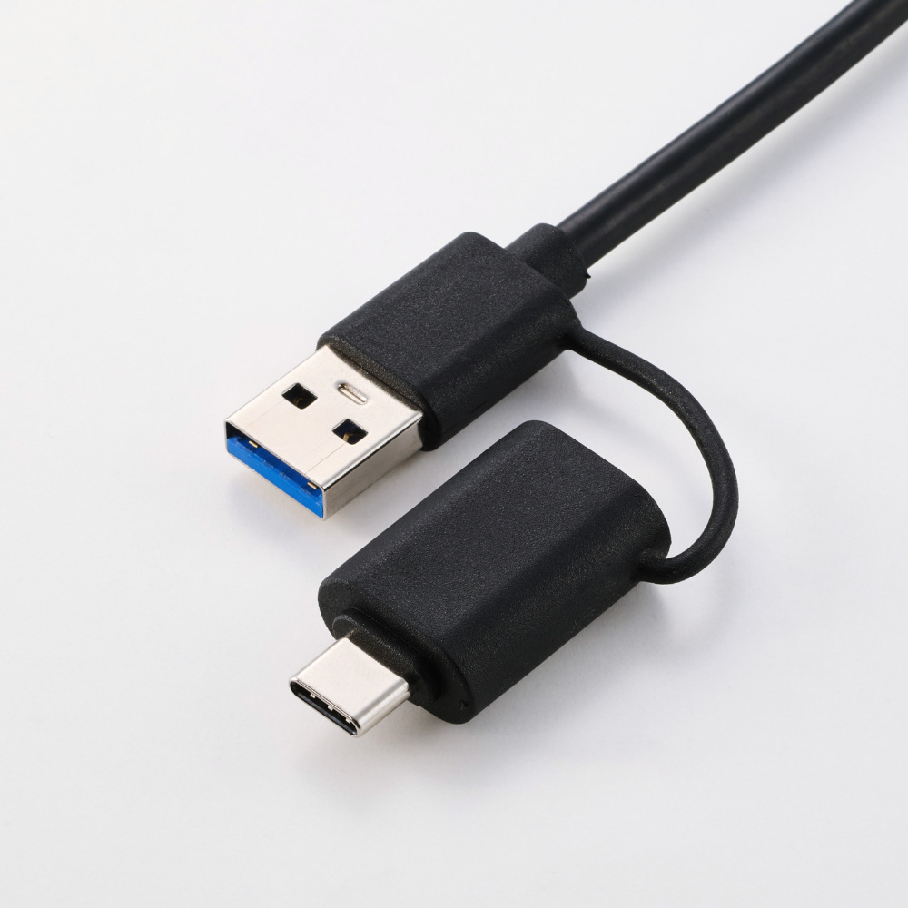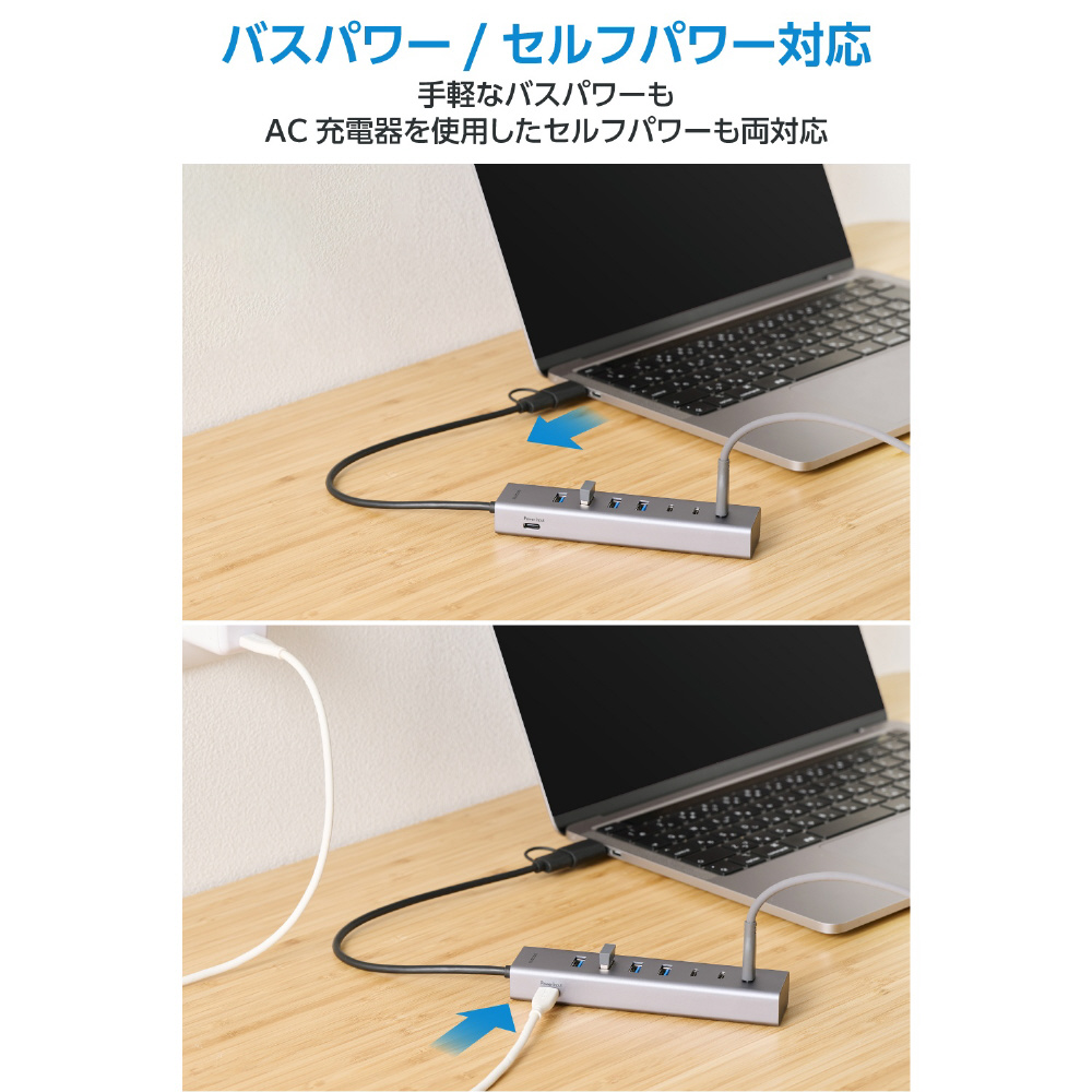 これ1台でポート不足を一気に解消!USB-AとUSB Type-C(TM)を合わせて7ポート搭載したUSBハブです。USB-AプラグをUSB Type-Cプラグに変換するアダプター付きで、機器を選ばず接続可能。バスパワー・セルフパワー両対応なので、充電器が不要な手軽さと安定した電源供給を両立します。