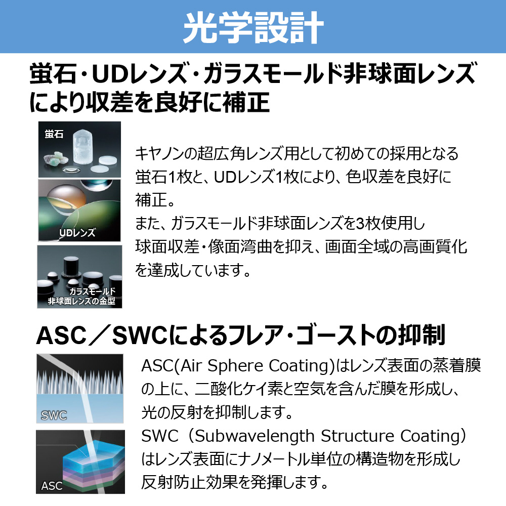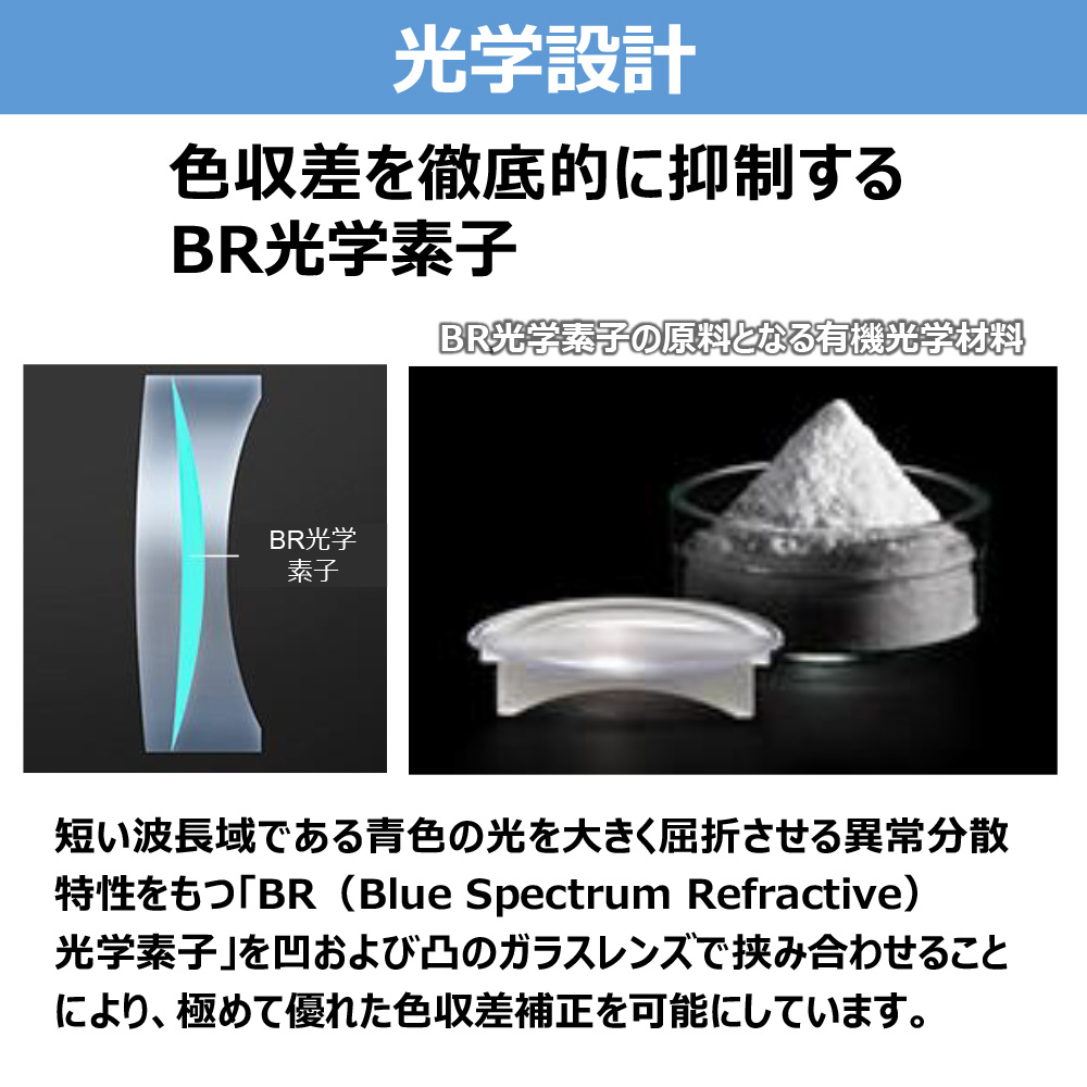 ※2 青色(短い波長域)の光を大きく屈折させる特長を持つBR(Blue spectrum Refractive)光学素子を採用し、高水準での色収差補正を実現した複合レンズ。
