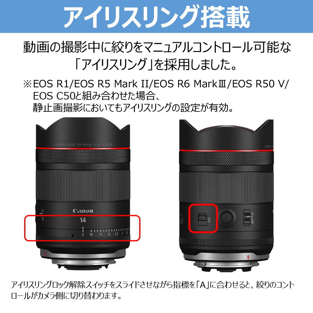 質量約578g、全長約112mmの小型・軽量設計で、「EF14mm F2.8L II USM」(2007年9月発売)と比較して、開放F値が2段明るくなったにもかかわらず、約10%軽量化しました。また、F1.4 L VCMシリーズは、外径を統一しているため、複数のレンズを組み合わせて使用する撮影現場などで利便性を発揮し、快適な撮影をサポートします。さらに、アイリスリング(絞りリング)を搭載することで主に動画撮影中の絞りのマニュアルコントロールが容易となり、撮影において高い操作性を発揮します。