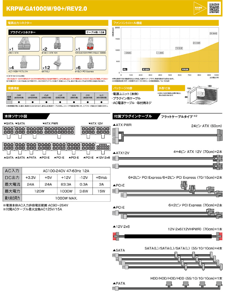 KRPW-GS1200W/90+は、16ピン電源コネクタ(12V-2x6)プラグインケーブルが搭載可能です。