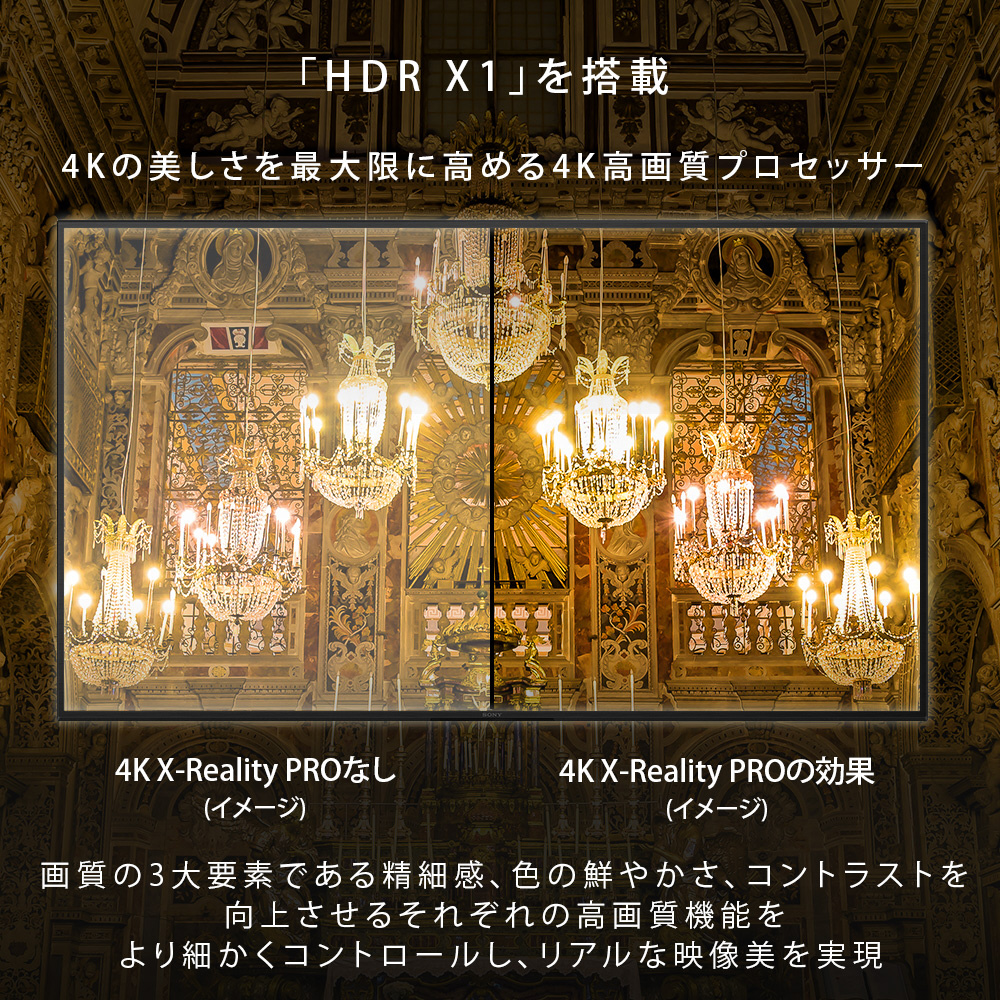 4Kの美しさを最大限に高める高画質プロセッサー「HDR X1(エイチディーアール エックスワン)」を搭載。画質の3大要素である精細感、色の鮮やかさ、コントラストを向上させるそれぞれの高画質機能をより細かくコントロールします。さらに、さまざまな映像を高コントラストなHDR相当の画質でリアルに描く「HDRリマスター」が映像の美しさを高めます。