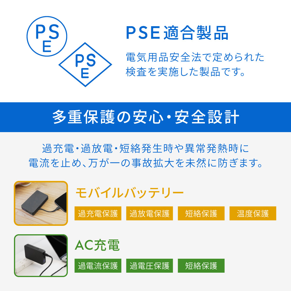 保護機能の「過充電(電圧/電流)保護」「過放電(電圧/電流)保護」「短絡(ショート)保護」「温度保護」を搭載し、高い安全性を備えております。