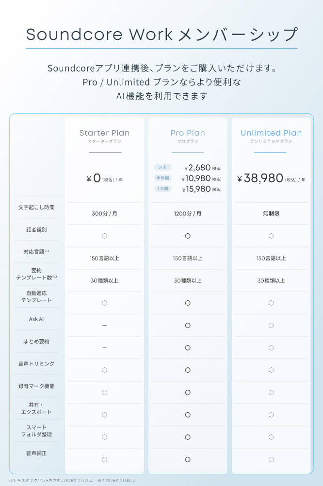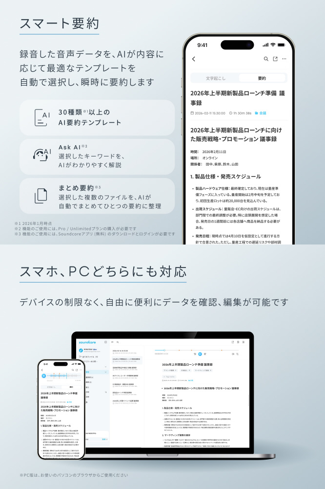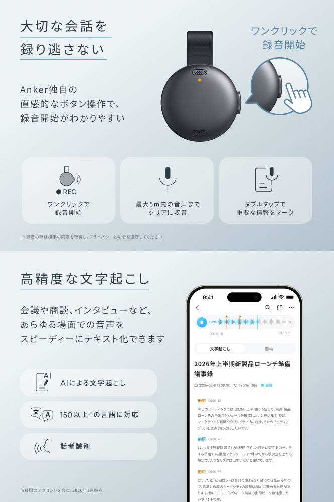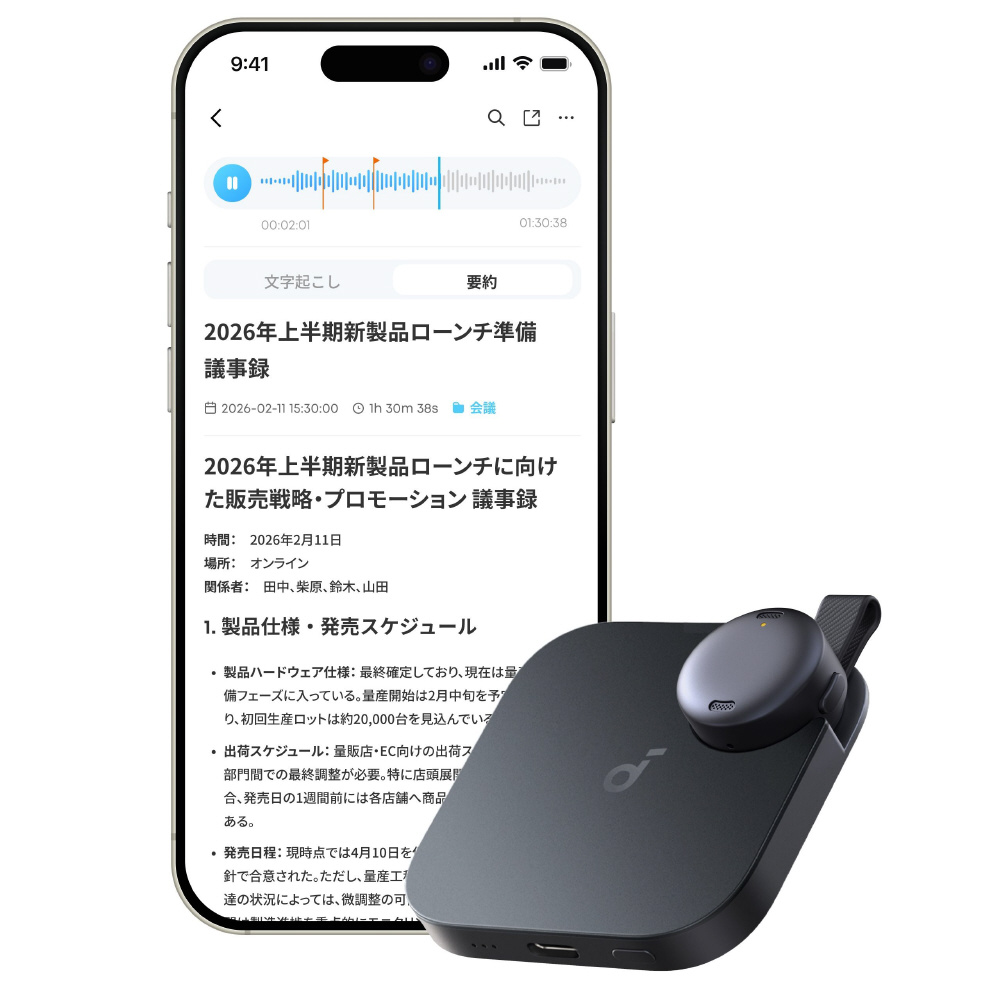 サイズ 約23 × 23 × 13mm(マイク本体) / 約60 × 60 × 15mm(カード型充電ケース含む)、重さ 約10g(マイク本体) / 約48g(カード型充電ケース含む)、AIモデル GPT-5.2 ※1(順次追加予定)、多言語対応 ◯(150以上の言語 ※2)、内蔵マイク MEMS × 2、連続録音時間 ※3 最大8時間(マイク本体) / 最大32時間(カード型充電ケース含む)、録音保存時間 最大250時間、スタンバイ可能時間 ※4(録音開始可能な状態での維持可能時間)10日間(マイク本体のみ) / 25日間(カード型充電ケース含む)、本体ストレージ 8GB、短時間充電 約10分 / 最大2時間、充電端子 USB Type-C、スマートフォンへの転送方法 Bluetooth / Wi-Fi、防塵・防水規格 IPX4 (マイク本体、カード型充電ケース両方)※1 連携デバイスによりAIモデルが異なります2026年2月時点。AIモデルは順次アップデート予定です※2 各国のアクセントを含む。2026年1月時点※3 録音可能時間は使用環境によって異なります ※4 実際のスタンバイ可能時間は、ご使用状況や環境により変動します※ AIによる文字起こしや要約機能を使用する際は、Soundcoreアプリのインストールとログインが必要です※ 録音の際は相手の同意を取得し、プライバシーと法令を遵守してください