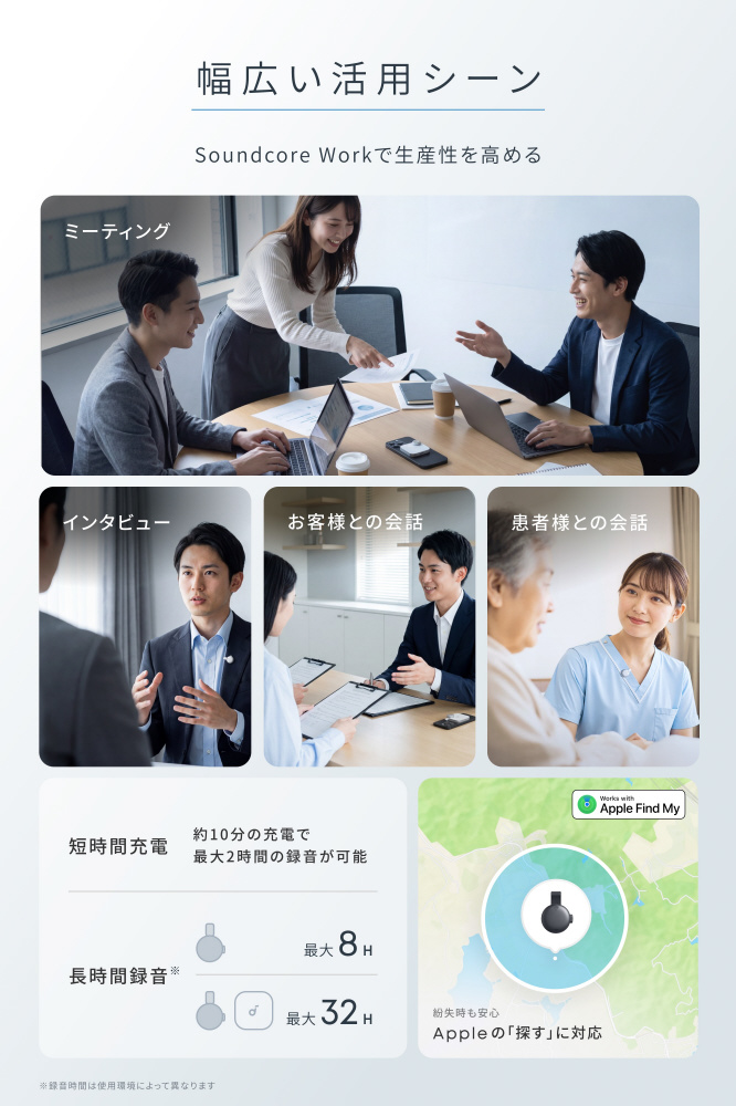 世界最小・最軽量※のウェアラブルAIボイスレコーダーで、商談メモ、会議の議事録などにかかる時間を節約できます。※マイク本体のみを指す。2026年1月時点、自社調べ