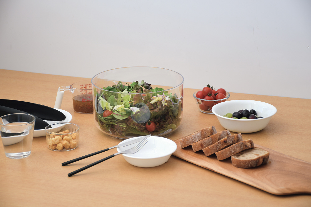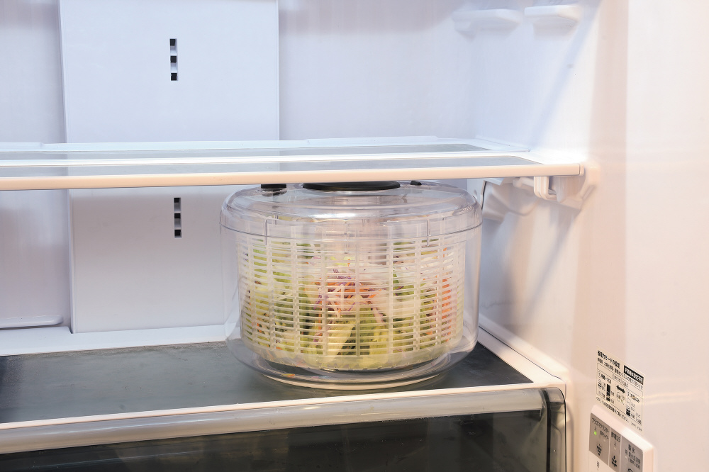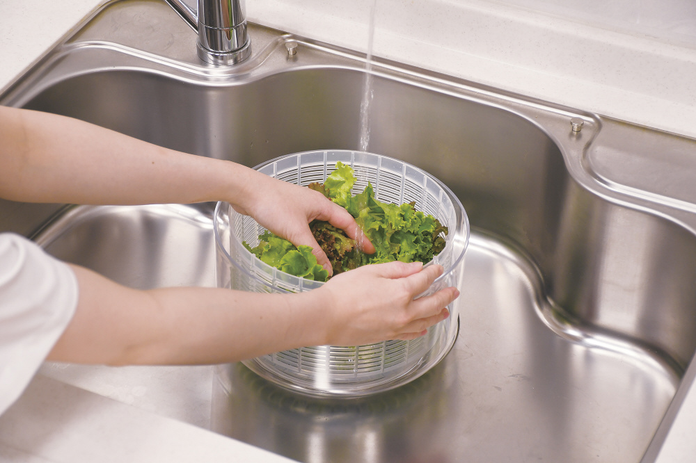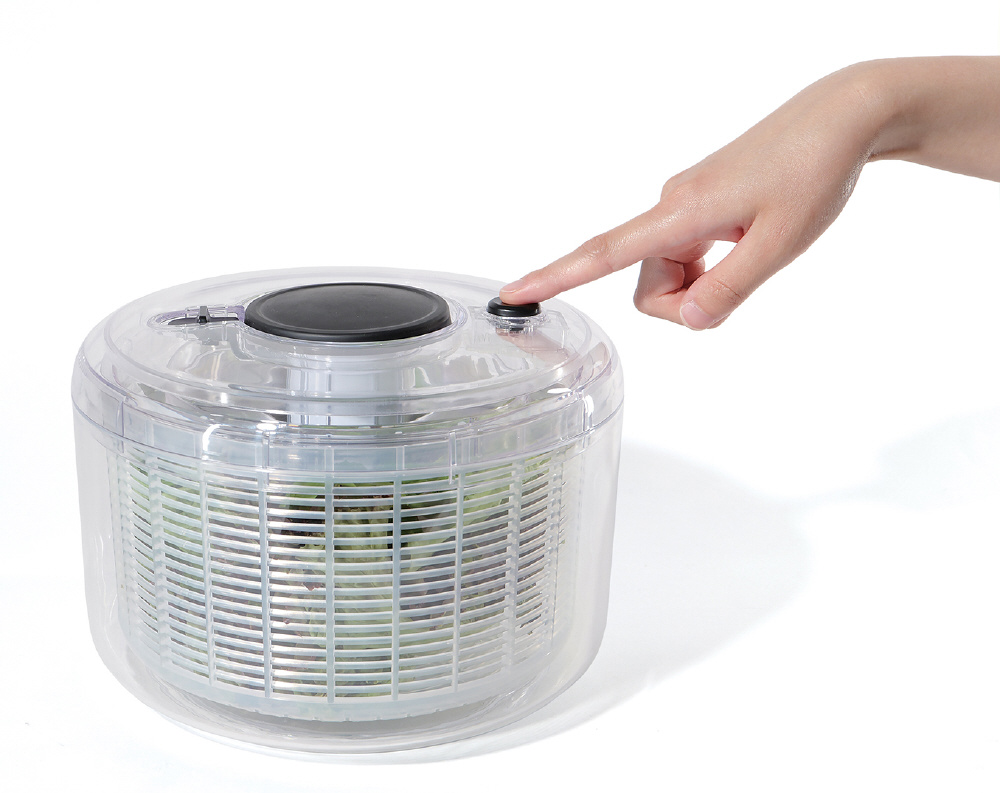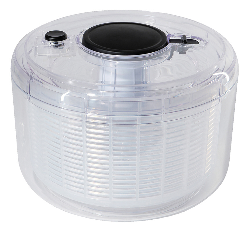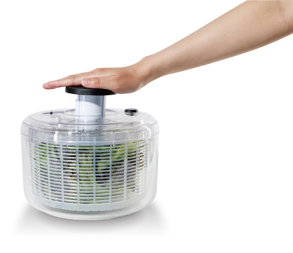 押すだけで簡単に野菜の水切り。プッシュハンドルロック機能バスケットを止めるブレーキボタン付すべり止め付。保存容器としても。ふたは固定されません。容器底の中央についている回転軸をおらないでください。回転しなくなります。プッシュ部ロックを解除する場合は必ずプッシュ部を手で抑えながら解除してください。ふたと回転板は分解できません。ふたの丸洗いはしないでください。食器洗い乾燥機には使用しないでください。