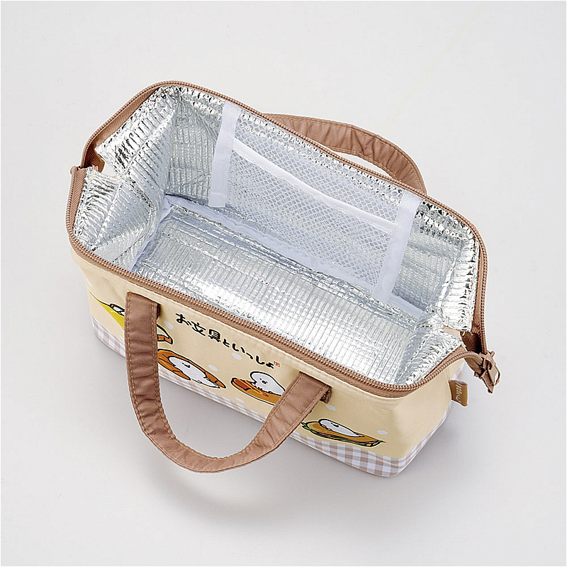 がま口型なので出し入れが便利。内側のアルミ蒸着フィルムは保冷に最適。保冷剤を入れるポケットも付いています。ちょっとしたお出かけのサブバッグや普段使いとしてサイフやスマホなどの小物を入れてもOK。