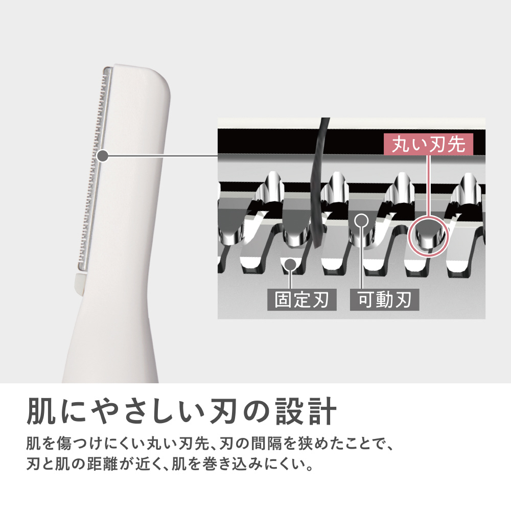肌を傷つけにくい丸い刃先、刃の間隔を狭めたことで、刃と肌の距離が近く、肌を巻き込みにくい
