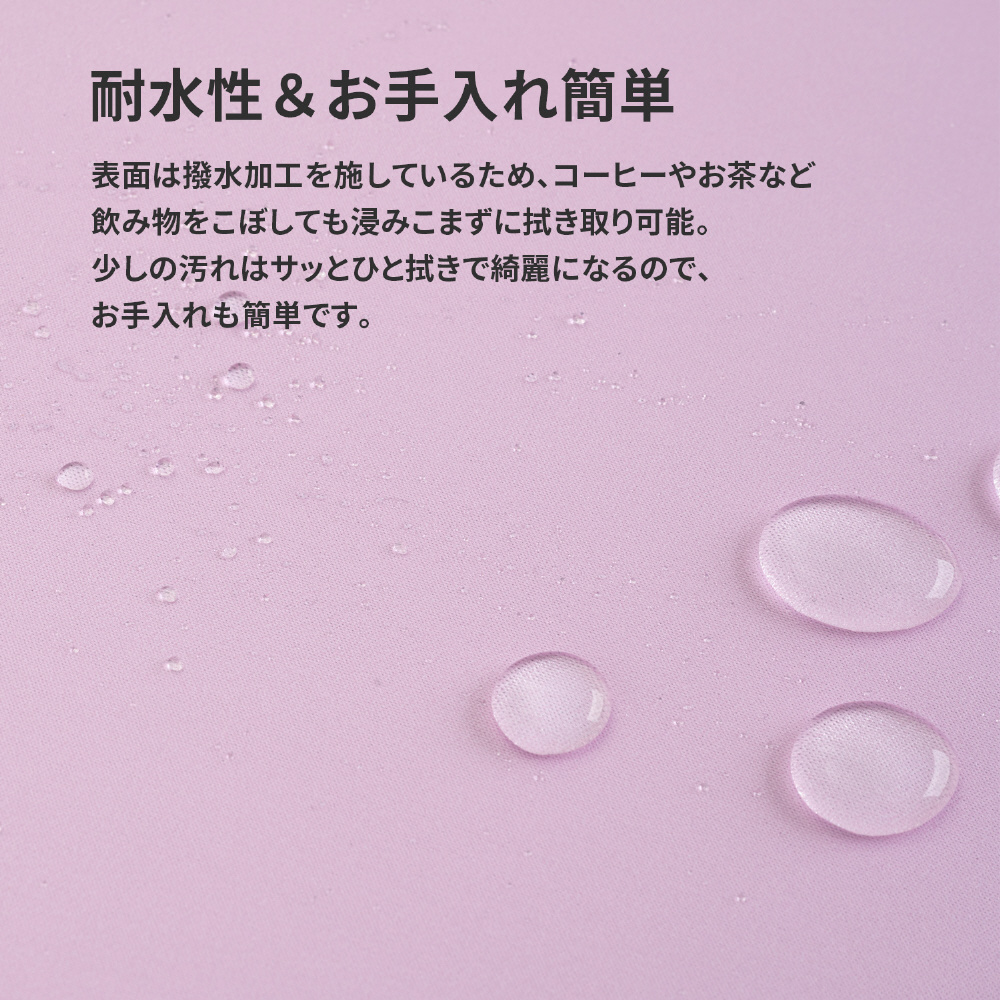 表面は撥水加工を施しているため、コーヒーやお茶など飲み物をこぼしても浸み込まずにふき取り可能。