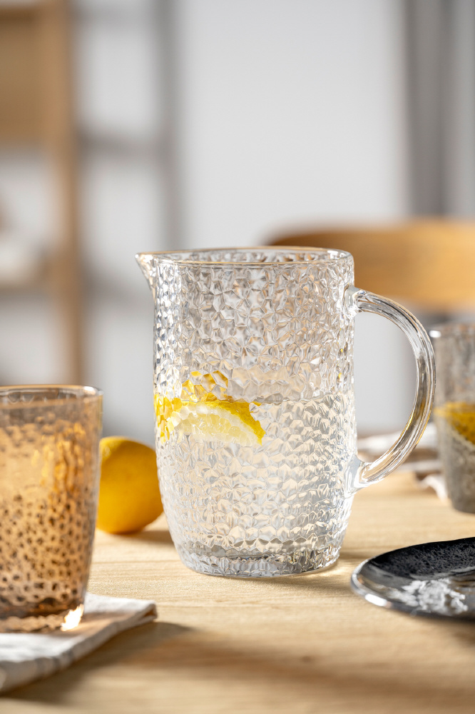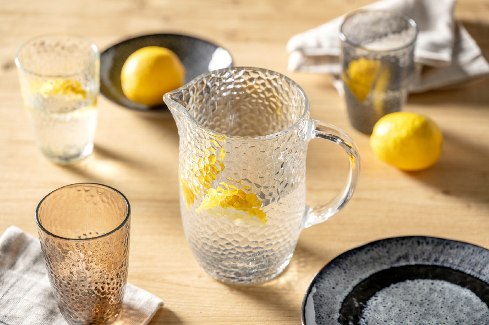 夏のテーブルに映えるMATERAサフタークグ。凹凸のある美しいデザインが、ソーダやアイスティーを一層華やかに演出します。手軽に注げる注ぎ口付きで使い勝手も抜群。クリアなガラスが飲み物を鮮やかに見せ、ガーデンパーティーやテラスでのひとときをより特別なものに。日常を彩る上質な一品です。
