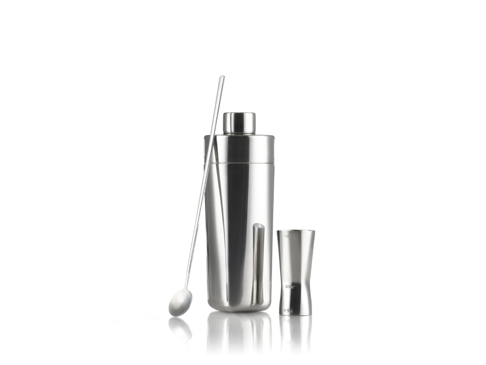 氷の溶ける美しさから着想を得たデザインが光る「Rocks」バーセット。高光沢ステンレス製のシェーカー(400ml)、ダブルジガー(2.5/5cl)、カクテルスプーンの3点セットです。シェーカーはフィルター内蔵で機能性も抜群。自宅で本格的なカクテルを手軽に楽しめる、スタイリッシュなバーウェアです。