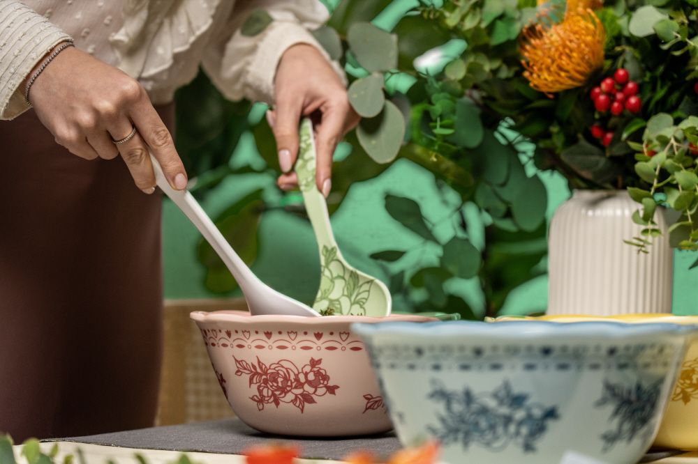 メラミン樹脂製で壊れにくく耐久性のあるテーブルウェア。フォーマルなランチや、自宅や屋外でのカジュアルなパーティーにも最適です。軽量なため取り扱いやすく、キッチンからテーブルへの移動も簡単。食器洗浄機使用可能です。ケーキドームとスタンドは取り外しができ、カトラリー立てとしても使えます。