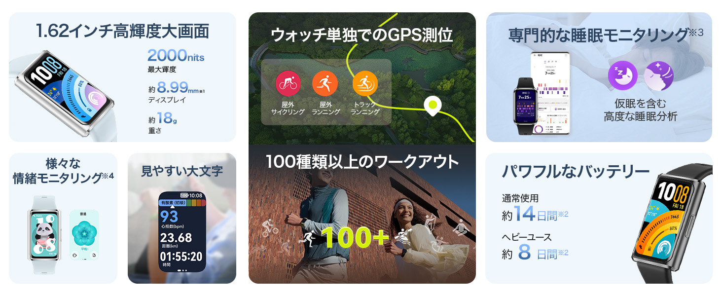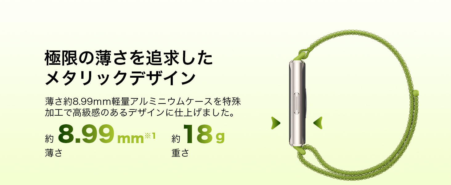 HUAWEI Band 11 Proは薄さ約8.99 mmのスマートウォッチとして、CNC加工を施したアルミニウム合金ケースを採用。