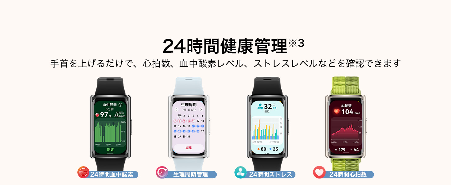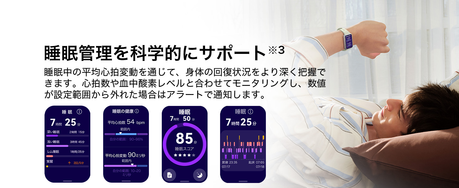 睡眠中の平均心拍変動(HRV)を通じて、身体の回復状況を把握できます。心拍数や血中酸素レベルと合わせてトラッキングし、個人の設定範囲を外れた場合は通知によって早めに気づくことができます。