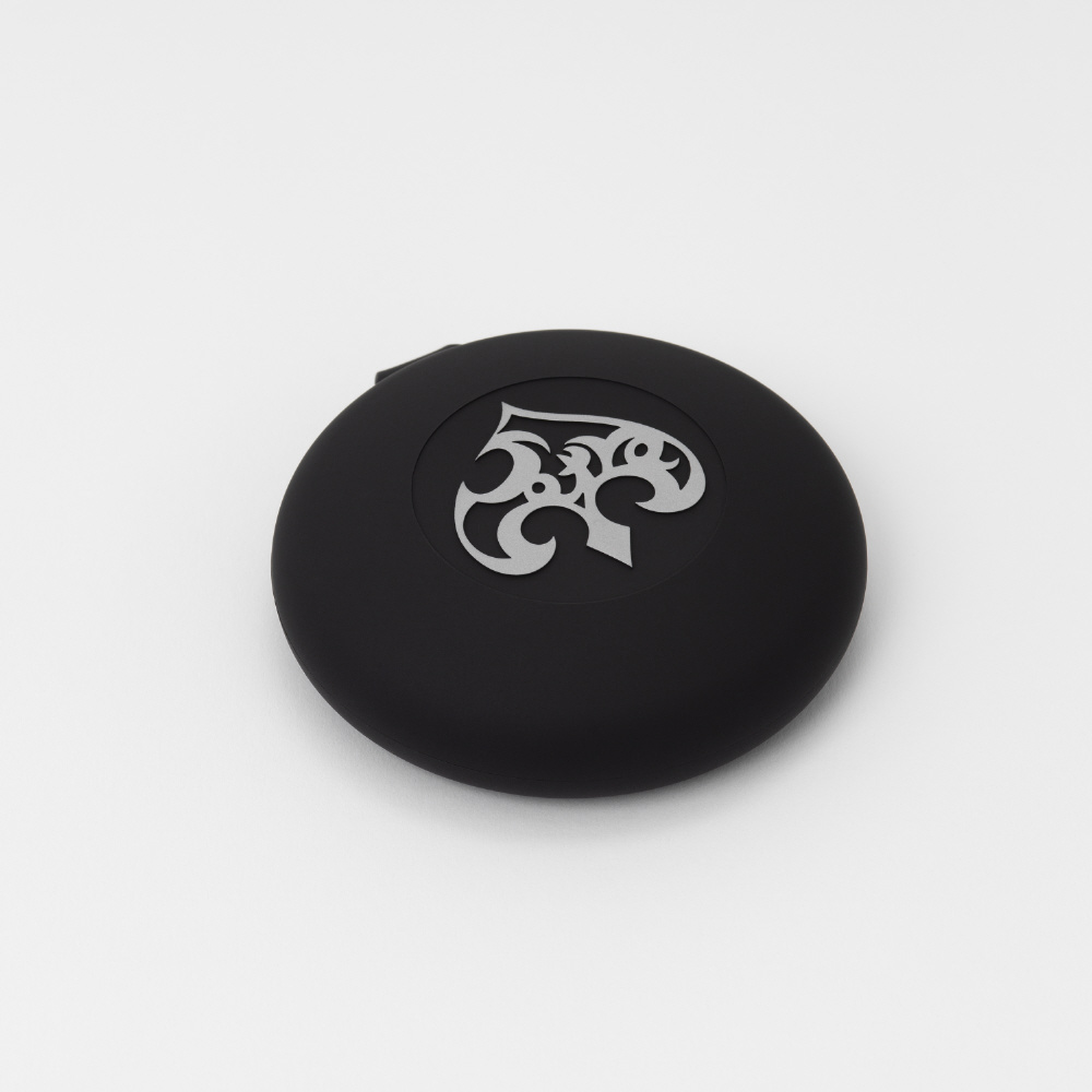 同梱のシリコン製ケースは、ケーブルを丸めて手軽に収納することができます。イヤホン本体はドーム状の薄いシリコンの蓋でソフトに固定され、コンパクトで持ち歩きにも便利です。ケースの蓋にもパトラさんオリジナルのクローバーマークを添えました。