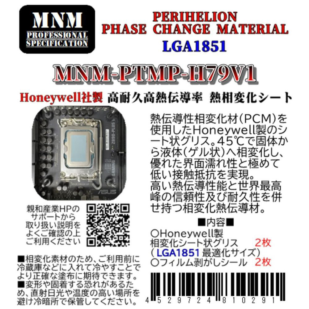 本製品は、PCM(相変化素材)のパイオニアであるHoneywell社製の純正素材を採用した、超高熱伝導相変化シートです。