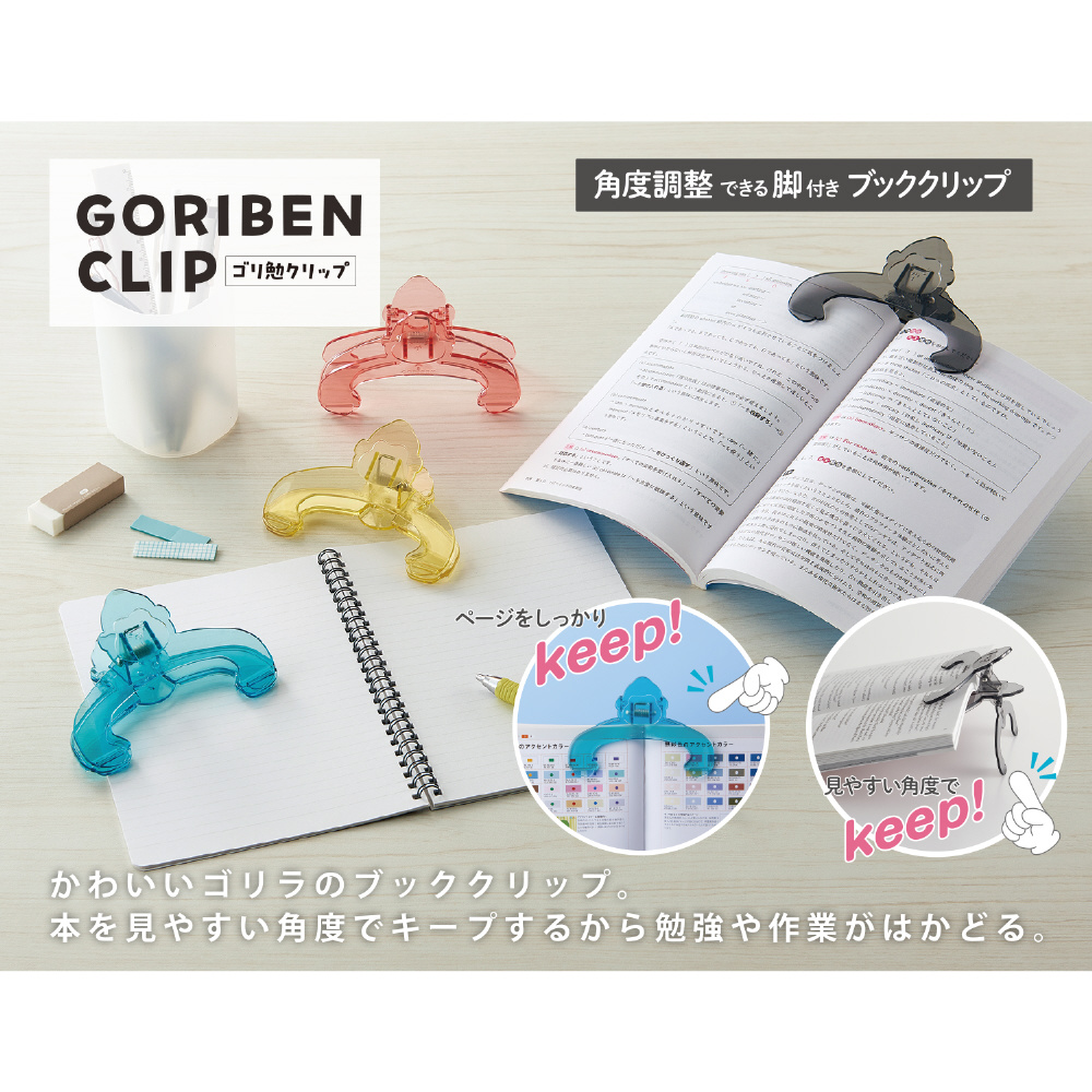 かわいいゴリラのブッククリップ!本を見やすい角度でキープする脚付きなので、勉強や作業がはかどる!
