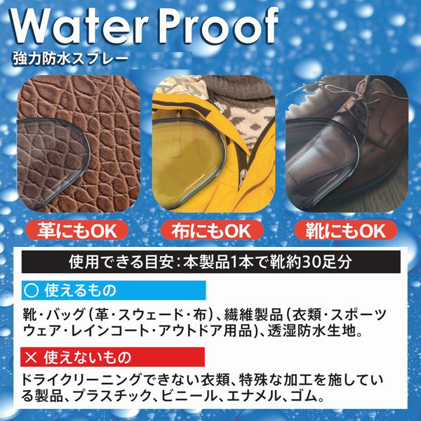 フッ素とシリコンのハイブリッド強力撥水で靴やバッグなどを雨や雪、泥水に含まれる汚れからしっかりガードします。