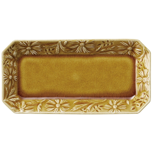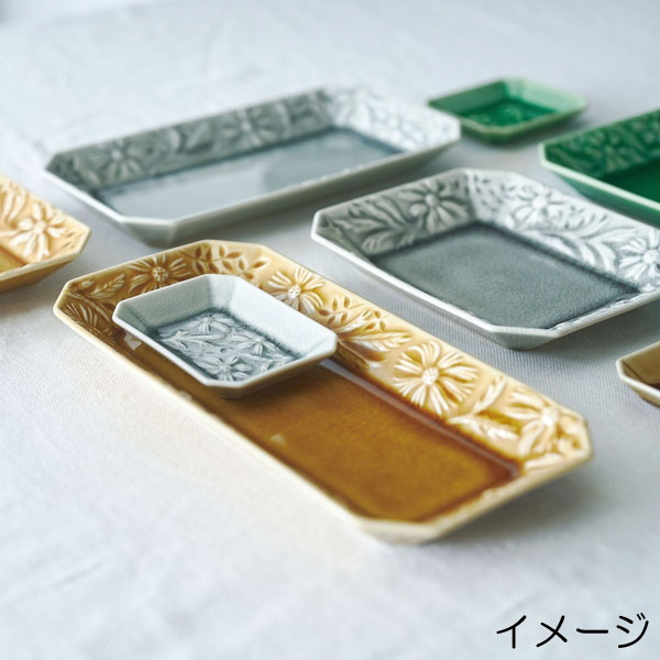 マーガレットのレリーフと美しい貫入の釉(うわぐすり)が食卓を品よく洗練された雰囲気にしてくれます。焼魚や巻き寿司、卵焼きなどの盛り付けに使いやすい長皿。