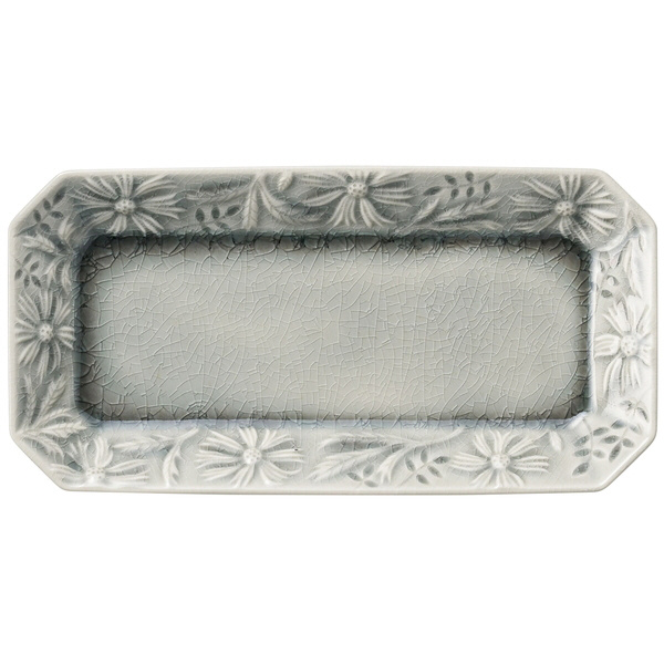 マーガレットのレリーフと美しい貫入の釉(うわぐすり)が食卓を品よく洗練された雰囲気にしてくれます。焼魚や巻き寿司、卵焼きなどの盛り付けに使いやすい長皿。