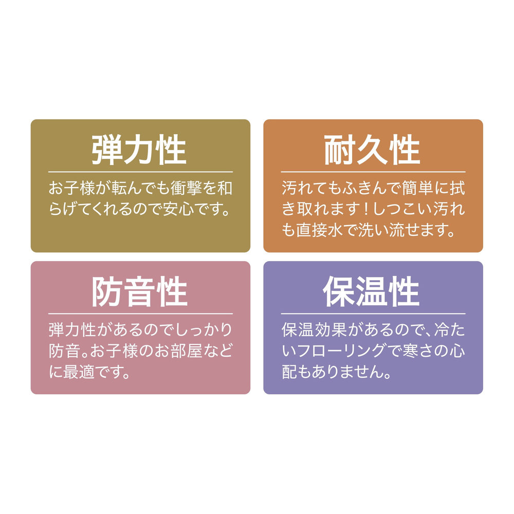 しっかりとした弾力で、お子様の足音や、振動などの気になる生活音をしっかりと吸収・軽減して騒音を抑えてくれます。
