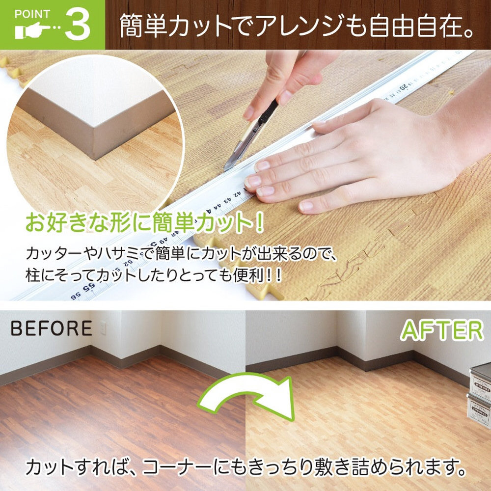 カッターやハサミで簡単にカットが出来るので、部屋の柱の隅などにもピッタリ敷き詰められます。