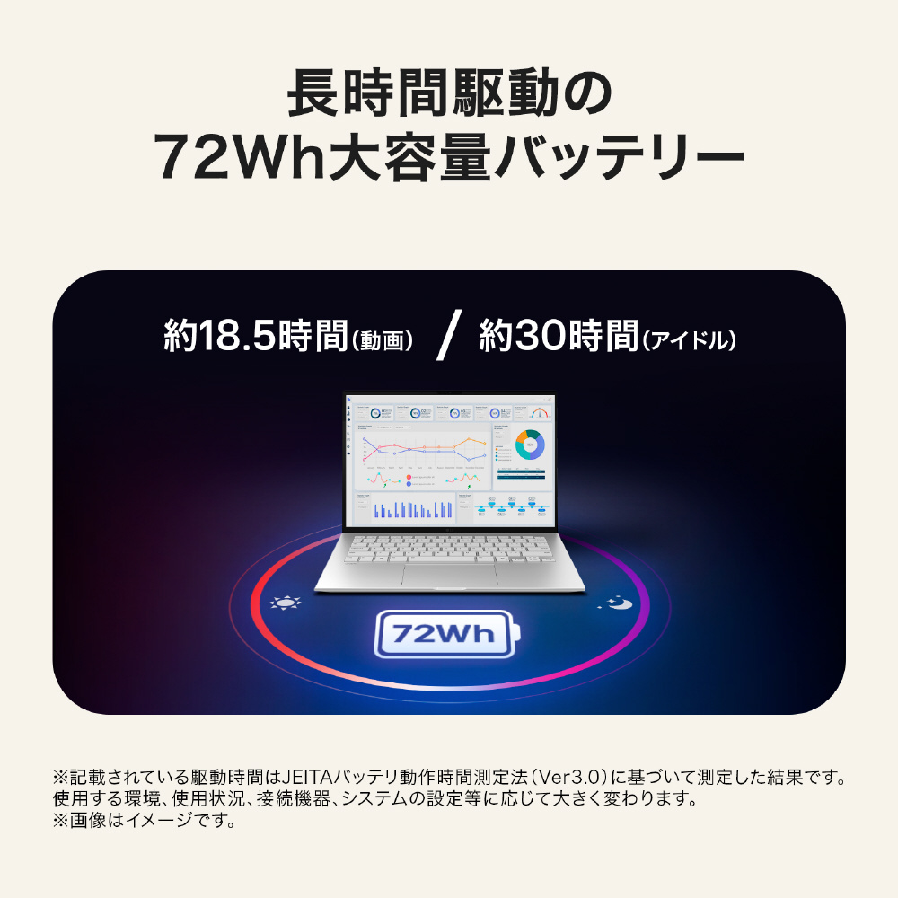 大容量バッテリーとAIによる省電力制御により、外出先でも電力を気にせず使え、最大18.5時間(動画)/30.5時間(アイドル)の持続時間で、時間や場所を選ばずやりたいことに没頭できます。