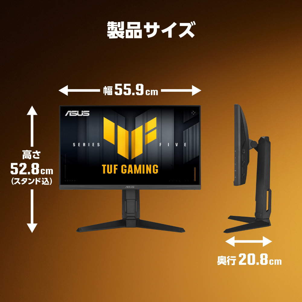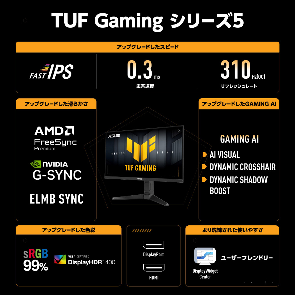 「TUF Gaming VG259QMRL5A」は、スピードと画質を両立させたFast IPSパネルを採用したゲーミングモニターです。310Hz(オーバークロック時)のリフレッシュレート、応答速度0.3msに加え、最新の「TUF Gaming AIテクノロジー」を搭載。競技性の高いFPSゲームから没入感のあるアクションゲームまで、あらゆるユーザーのパフォーマンスを最大化させる仕様となっています。