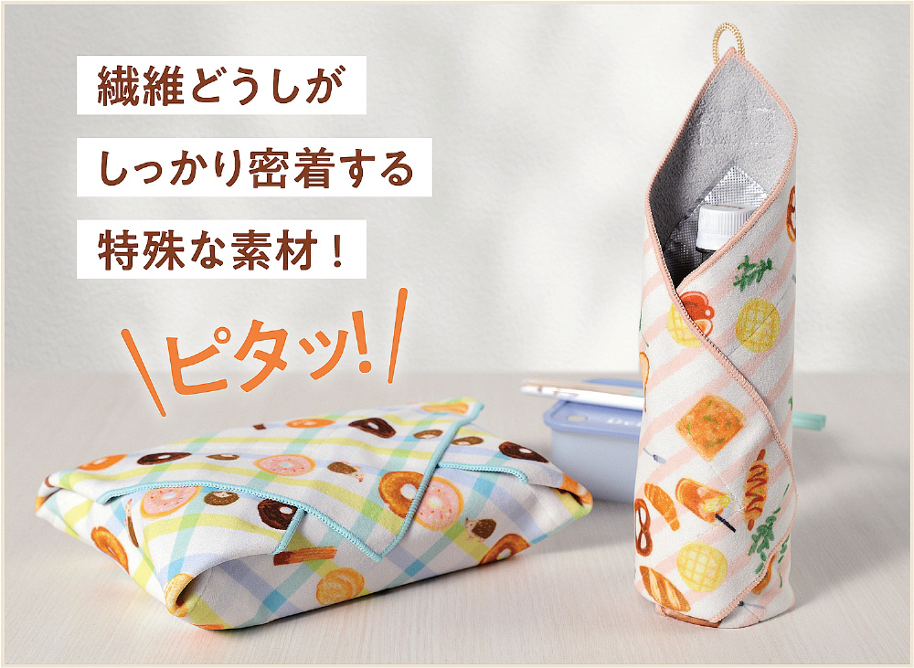 巻くだけでくっつく特殊繊維のクロスです。結ばずにお弁当箱を包めるので、結ぶのが苦手なお子様にもぴったりです。