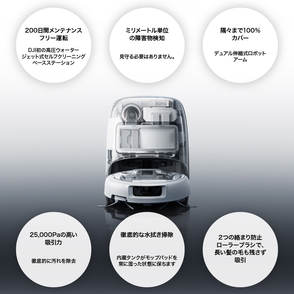 ROMO Pは、フラッグシップドローン由来の最先端認識技術と電気機械技術を融合。高度なセンサーとスマートアルゴリズムにより、フローリングからカーペットまで徹底清掃し、汚れを見逃しません。さらにセルフクリーニングシステムが自動でメンテナンスを行い、最小限の手間で清潔な住まいを保てます。