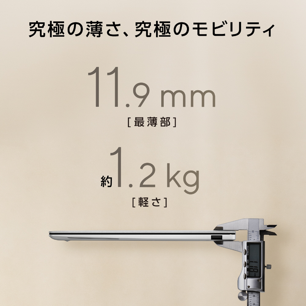 驚異の11.9mmの薄さと約1.2kgの軽さを実現。デュアルファン搭載でパフォーマンスも犠牲にすることはありません。高いモビリティ性能で、かつてない生産性と驚きをお届けします。