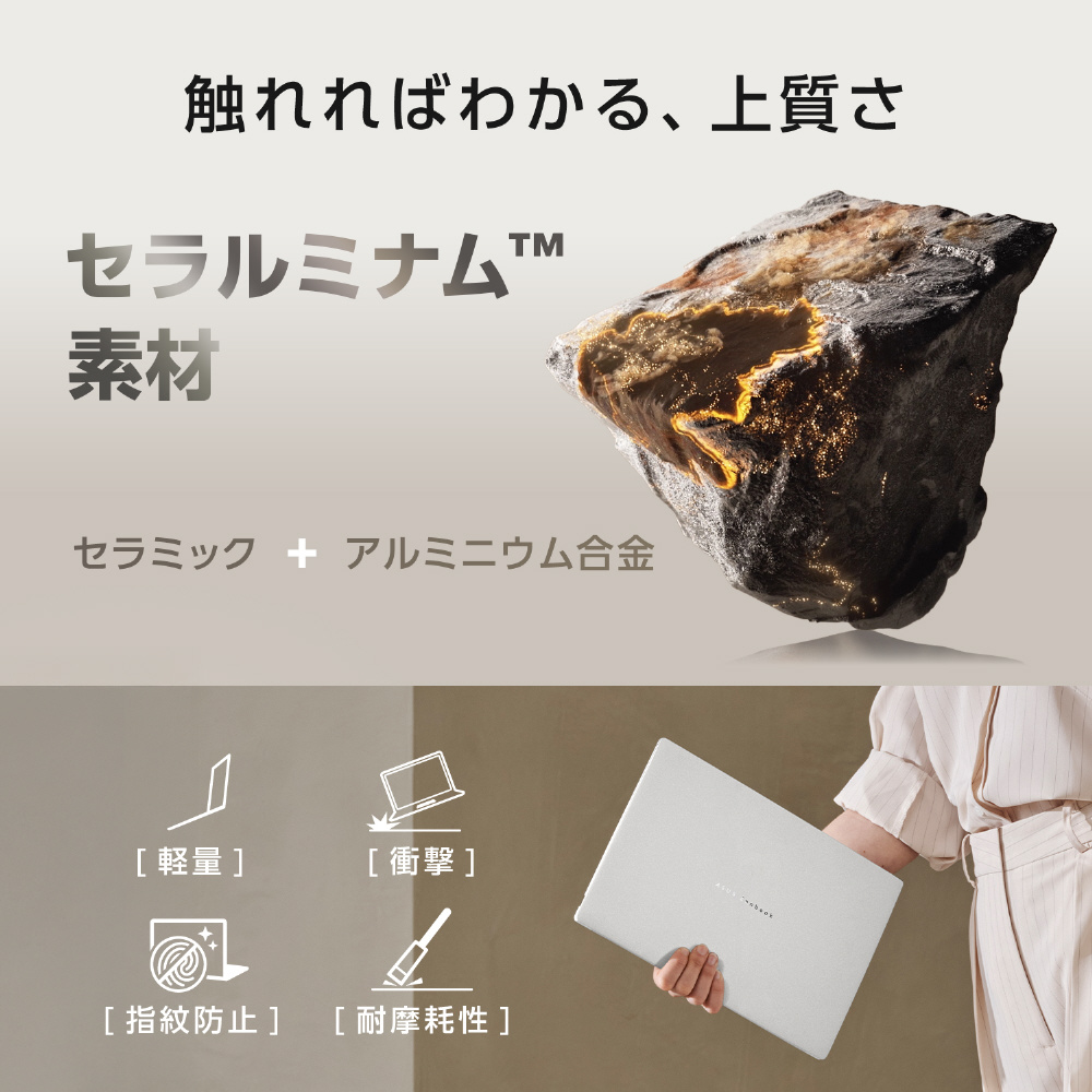 セラミックの美しい質感とアルミニウム合金の軽さ・堅牢性を兼ね備えた独自のセラルミナム素材を本体に採用。傷や汚れにも強く、インスピレーションを生む現代的なカラーと、CNC加工の精密な職人技が相まって、他にない唯一無二のノートPCとして長い間使用いただけます。