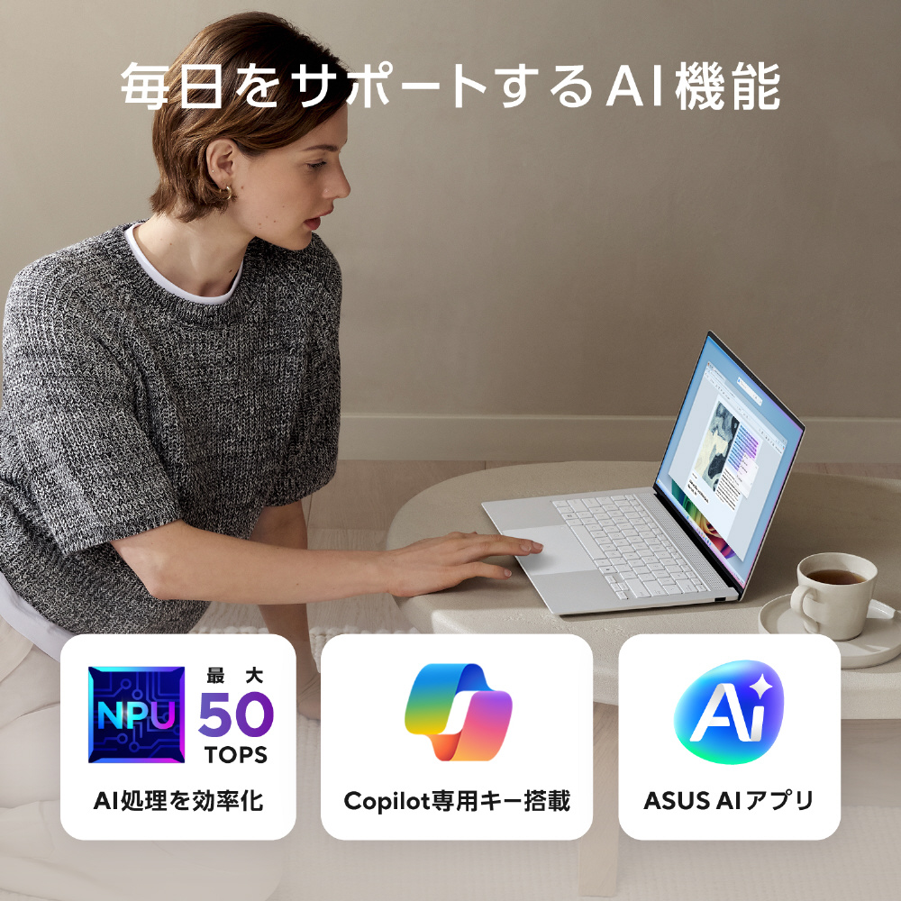 毎日のAIアシスタント Microsoft Copilotに加え、マルチメディアデータを自動でカテゴライズし、整理をしてくれるソフトウェアStoryCubeやカメラがユーザーの有無を認識してディスプレイの明度を調整するAiカメラなど、独自のAI機能も各種搭載。面倒なことはAIに任せて、生まれた時間を有意義に活用できます。