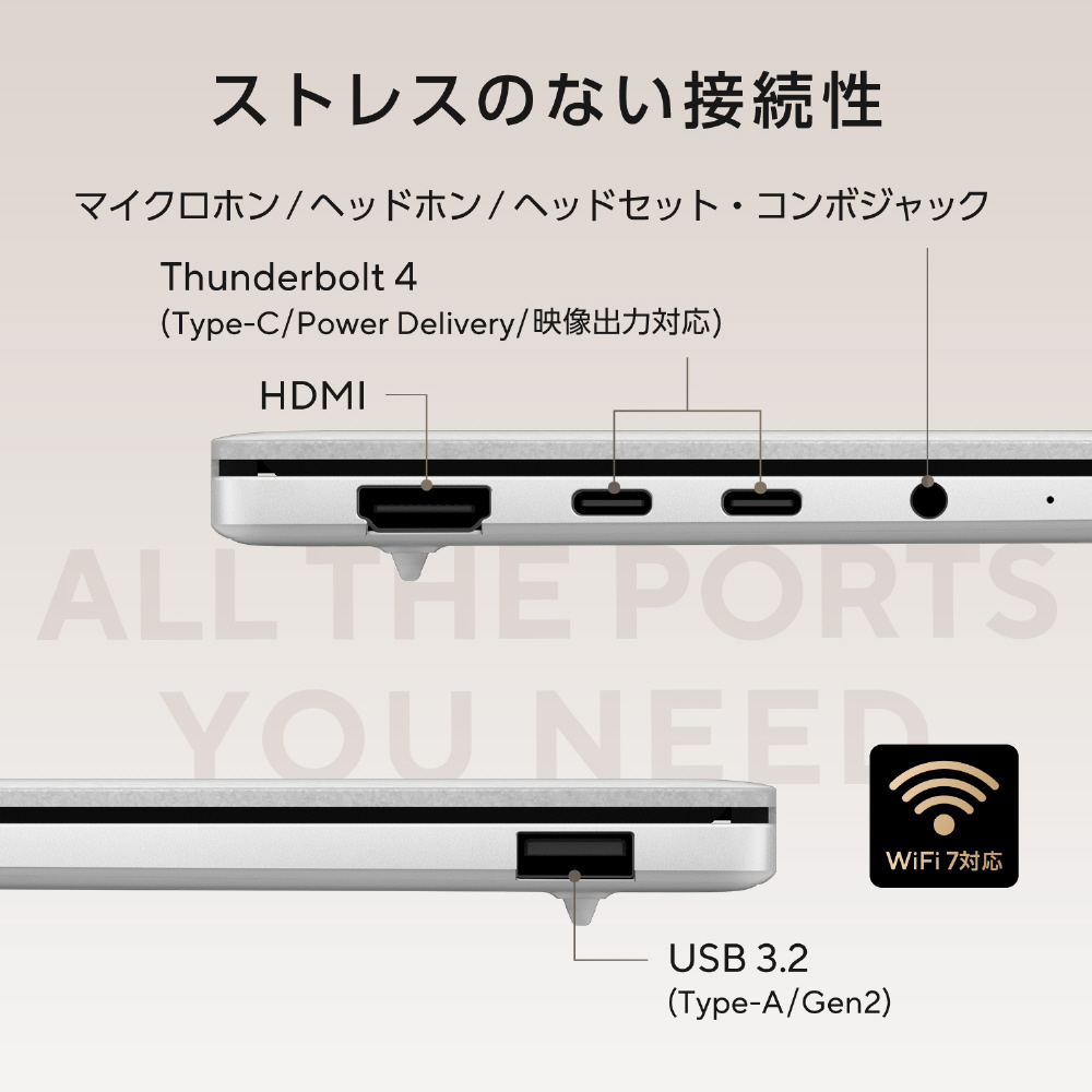 スリムなボディに高速接続を可能にするThunderbolt 4 (Type-C)をはじめ、USB 3.2 (Type-A/Gen2)、HDMIといった豊富なインターフェースを搭載。どこにいても生産性を損ないません。また、Wi-Fi 7規格にも対応し、長期的な使用を見据えた次世代の接続性を備えています。