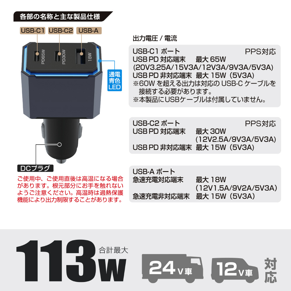 | 商品名 | シガーチャージャー DC-113WUSB3ポートPD(65+30)W+18W DC-063 |
