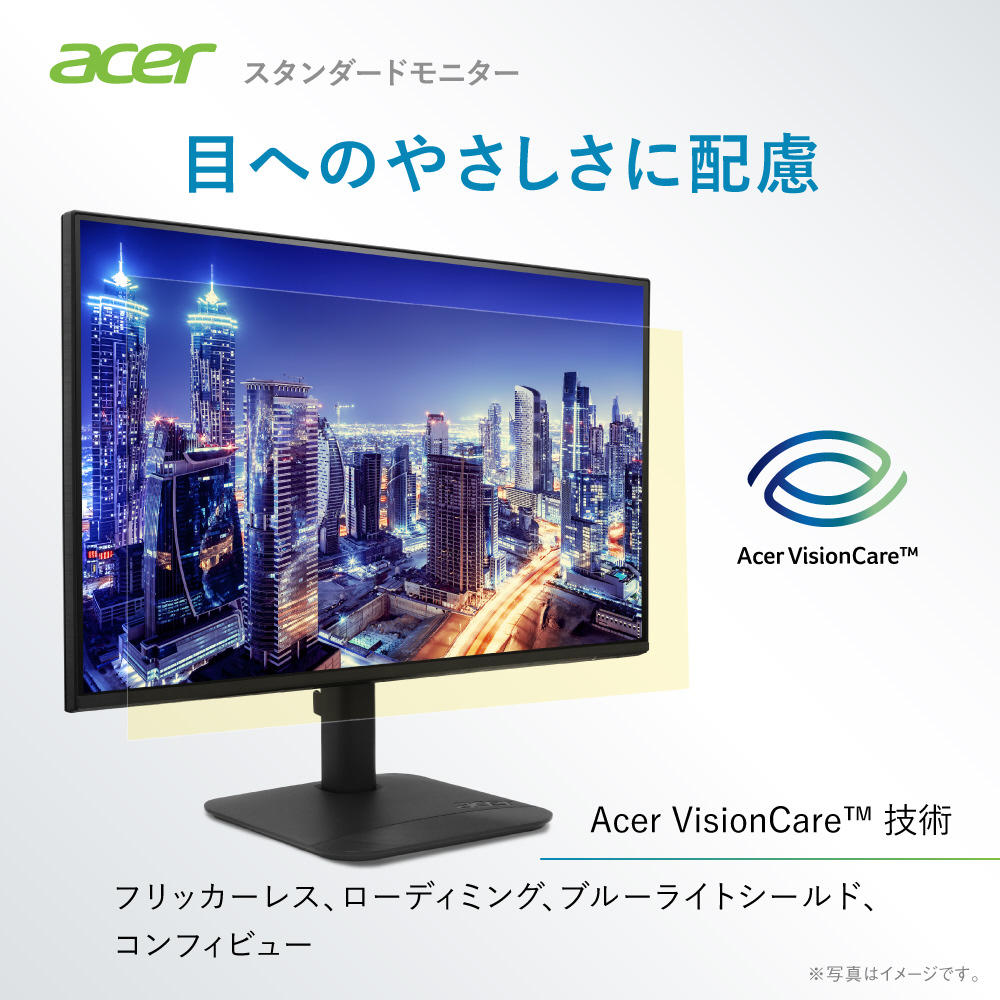 長く快適に使っていただけるよう、Acer VisionCare?技術を採用。画面のちらつきを抑えるフリッカーレス、暗い環境で明るさを調整するローディミング技術、眼精疲労の要因となるブルーライトを軽減するブルーライトシールド、パネル表面のざらつきや映り込み、外光反射を抑えるコンフィビューディスプレイなど、目へのやさしさに配慮した仕様です。
