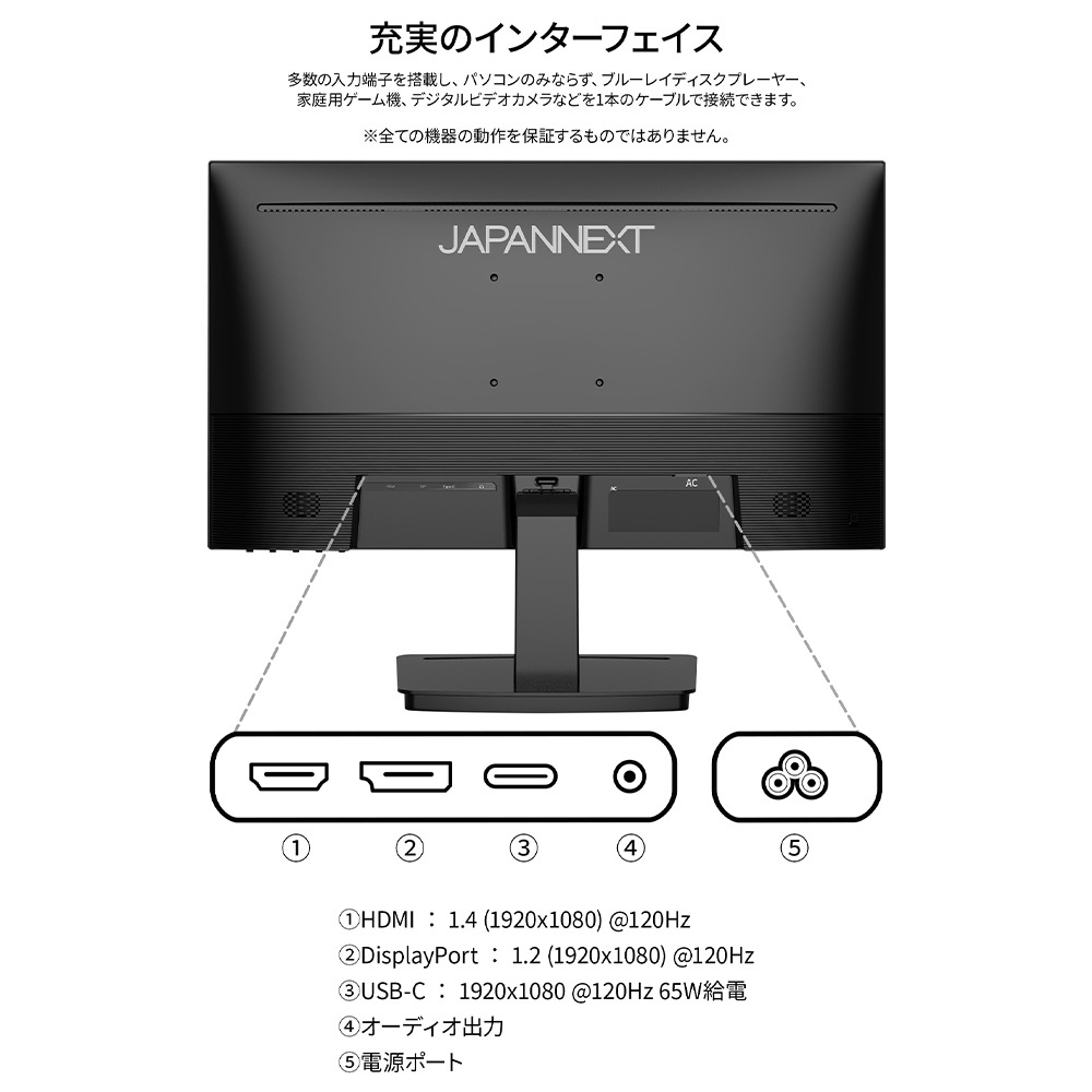 ■インターフェイスはHDMI 1.4×1 (120Hz)、DisplayPort 1.2×1 (120Hz)、そしてUSB-C×1 (120Hz/最大65W給電)を搭載し、様々なタイプの機器との接続が可能です。USB-C(最大65W給電)は、対応のPCであればUSB-Cケーブル1本でモニターへの映像出力とノートPCへの給電が可能。ケーブル1本でスッキリ接続出来るだけでなく、テレワーク、出社併用の場合などノートPCのACアダプターを持ち運ぶ必要が無くなります。