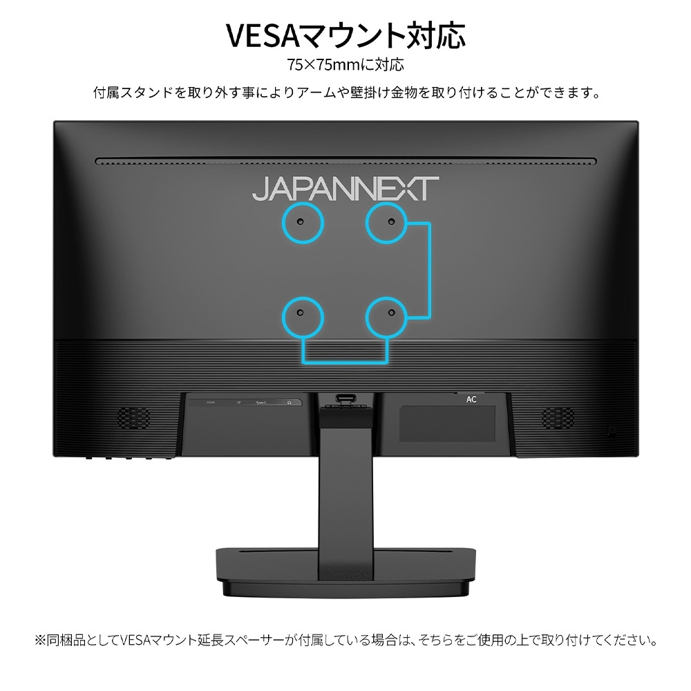 ■75×75mmのVESAマウントに対応しますので、別売りのモニターアームなどに使用が可能です。