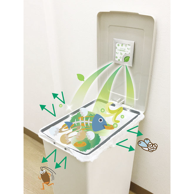 ごみ箱のニオイを消臭し、コバエが生ごみに卵を産みつけることを抑制します。