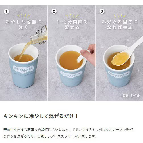 事前に本体を冷凍庫で約10時間冷やしたら、ドリンクを入れて付属のスプーンで5〜7分程かき混ぜるだけ。美味しいアイススラリーが完成します。