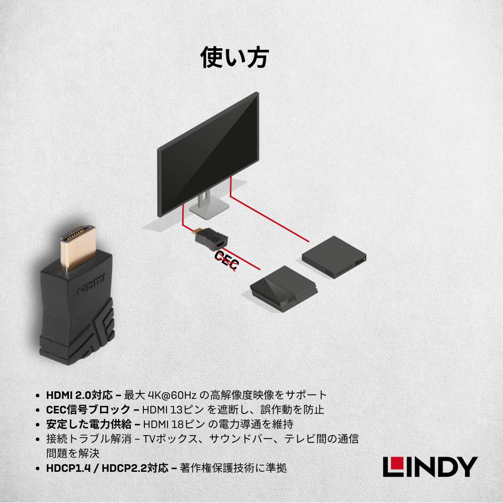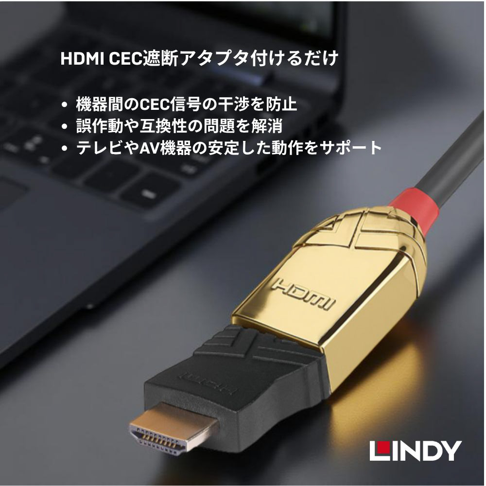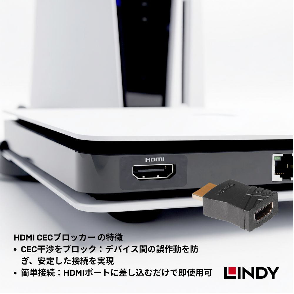 HDMI機器同士の連動機能を制御し、接続トラブルを解消するプロ仕様のCEC遮断アダプタです。テレビやサウンドバー、PCなどの間で意図しない電源のオン・オフや入力切替が発生する「CEC競合問題」を、物理的に信号をカットすることで解決します