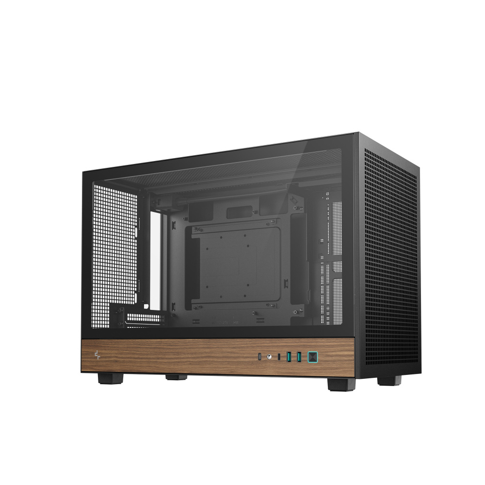 木目調デザインのサイドI/Oパネルを採用。背面コネクタ設計のマザーボードに対応し、高い冷却性能と拡張性を実現するミニタワー型PCケース