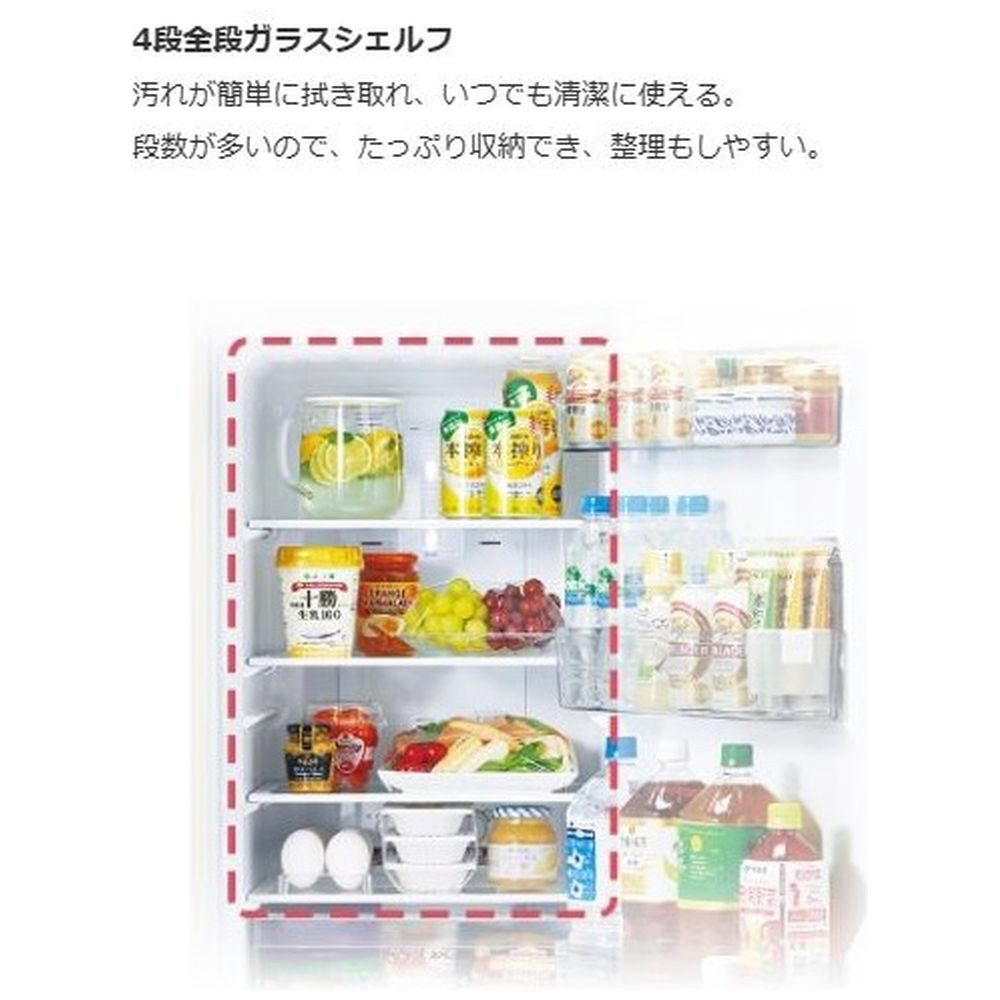 46Lの余裕の収納力でまとめ買いや作り置きもOK。上段はカップアイスなど背の低いものを、下段は500mLのペットボトル*や食パンなど背の高いものをすっきり収納することができます。