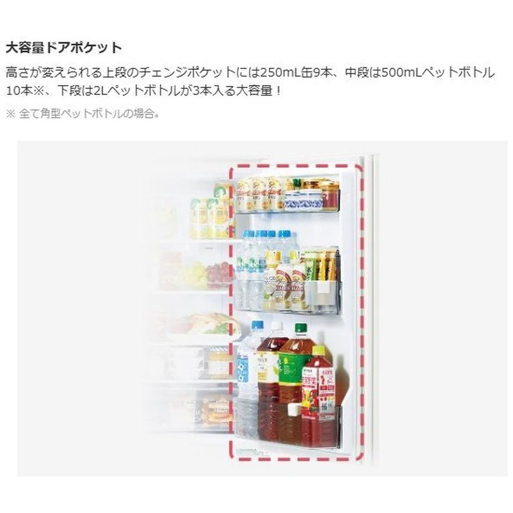 高さが変えられる上段のチェンジポケットには250mL缶9本、中段は500mLペットボトル10本*、下段は2Lペットボトルが3本入る大容量!