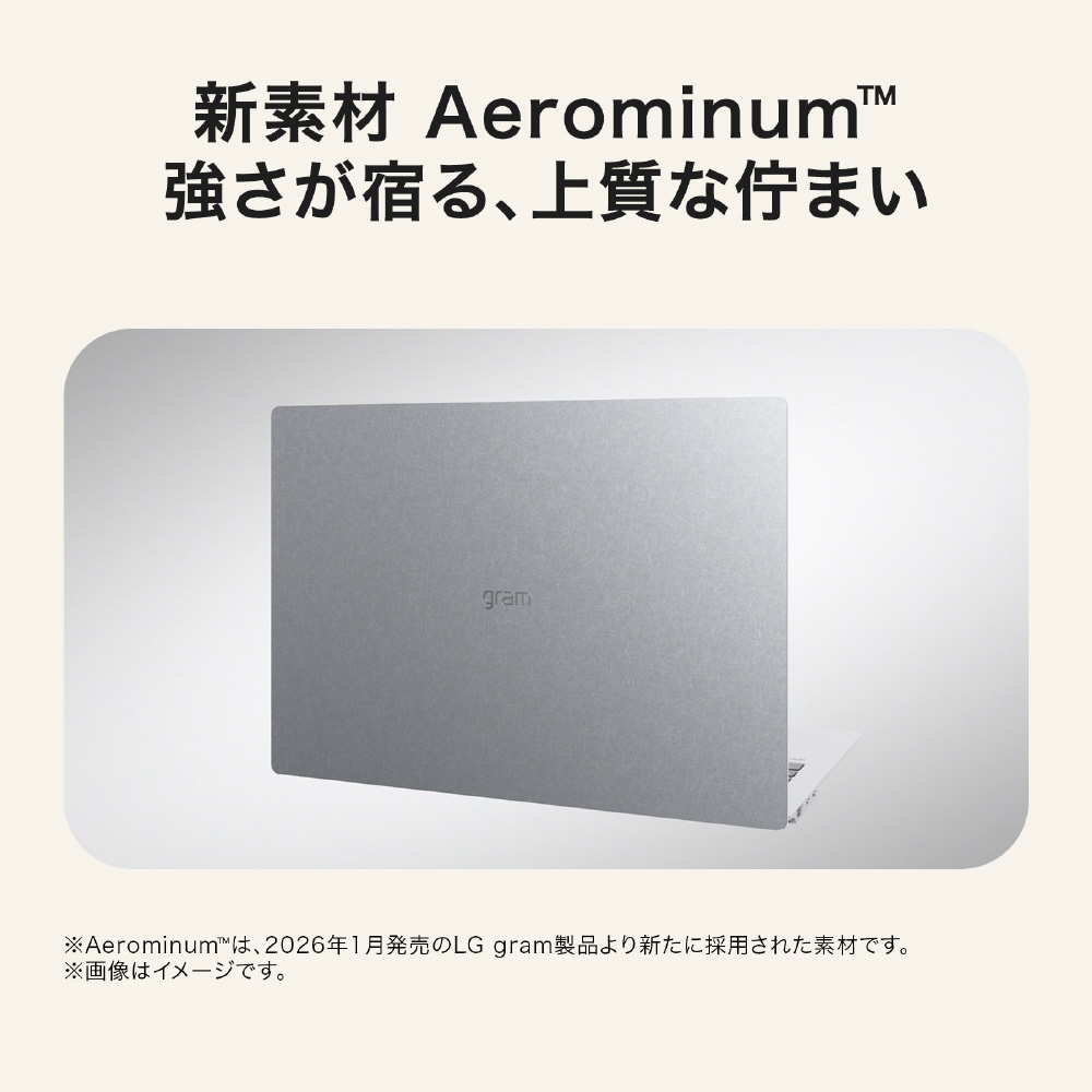 新素材のAerominum合金が、LG gramの軽さを保ちながら耐久性を高めます。アトリエ調のブラッシュド仕上げは、傷つきにくさや指紋・皮脂の目立ちにくさに配慮し、品位ある外観を保ちます。