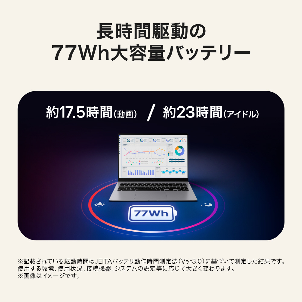 大容量バッテリーとAIによる省電力制御により、外出先でも電力を気にせず使え、最大17.5時間(動画)/23時間(アイドル)の持続時間で、時間や場所を選ばずやりたいことに没頭できます。