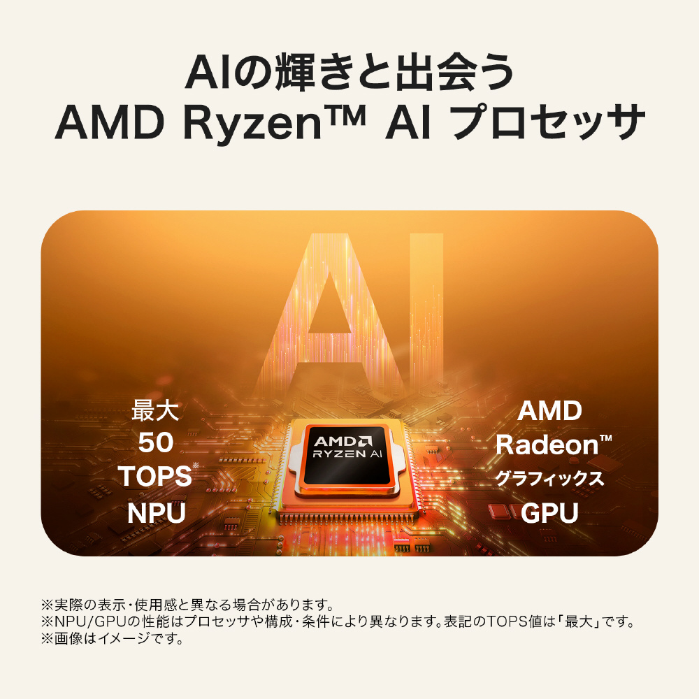 AMD Ryzen AI 5 435 プロセッサとAMD Radeonグラフィックスによる高速な応答性に加え、AI処理を担うNPUが、生成や解析を含む負荷の高いタスクでも安定したパフォーマンスを発揮します。