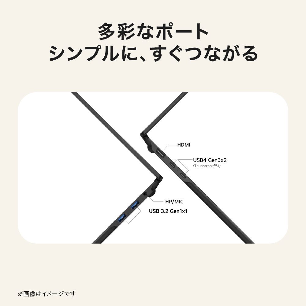 省電力設計と最大16GB LPDDR5X メモリ、最大512GB SSD NVMe(Gen4)、加えてM.2拡張スロット×1※を実装。動画編集やAIタスクをスムーズに進められます。