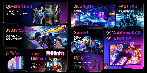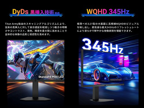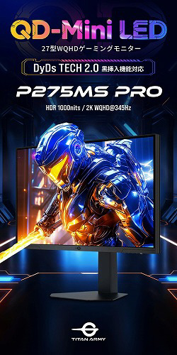 TITAN ARMY P275MS PROはMini LED、量子ドット技術を搭載し1152ゾーンのローカルディミングに対応した27型345Hz対応の高性能ゲーミングモニターです。