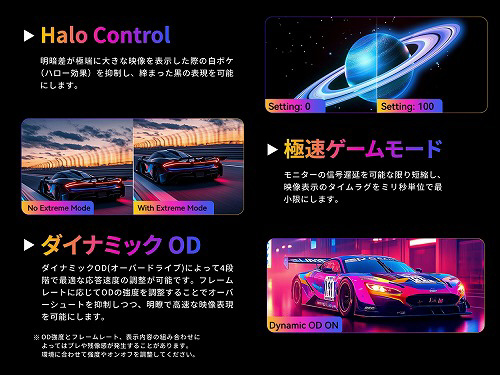 独自のDyDs(ダイナミックディスプレイ)TECH 2.0により黒挿入技術とリフレッシュレートを可変制御するAdaptiveSync機能の同時併用を実現。高リフレッシュレート下での残像感を更に低減し、動きの激しい場面でも極めて明瞭な表示を実現します。
