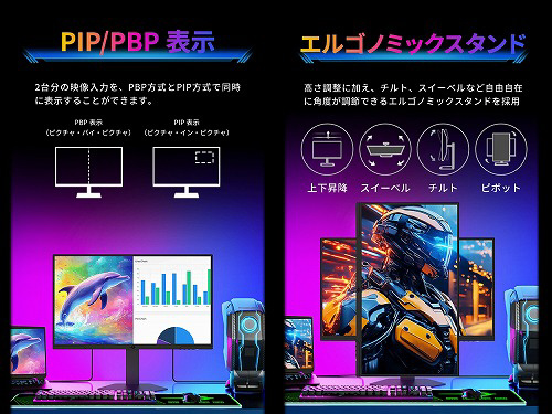 ディスプレイポートを1つ、HDMI 2.1ポートを2つ搭載し、置きやすく大画面な27型のディスプレイに高精細なWQHD解像度で様々なコンテンツを楽しめます。また、2台のPCやゲーム機を分割表示するPBP/PIP方式に対応し、左右2分割や親画面/子画面に分割して2つの映像を同時に表示することができます。付属スタンドにより正確な上下昇降、チルト、スイーベルが可能です。100×100サイズのVESAマウントに対応しています。